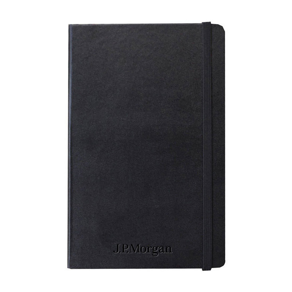The popular, classic, large ruled Moleskine journal is a handy 5.25 x 8.25 inch desk-sized notebook made with a durable thread-bound binding. It offers 240 lined, acid-free paper pages. Known for its quality construction, this notebook opens flat and is a pleasure to write in. The J.P. Morgan logo is debossed on the bottom center of the front cover. FSC Mix Certified.