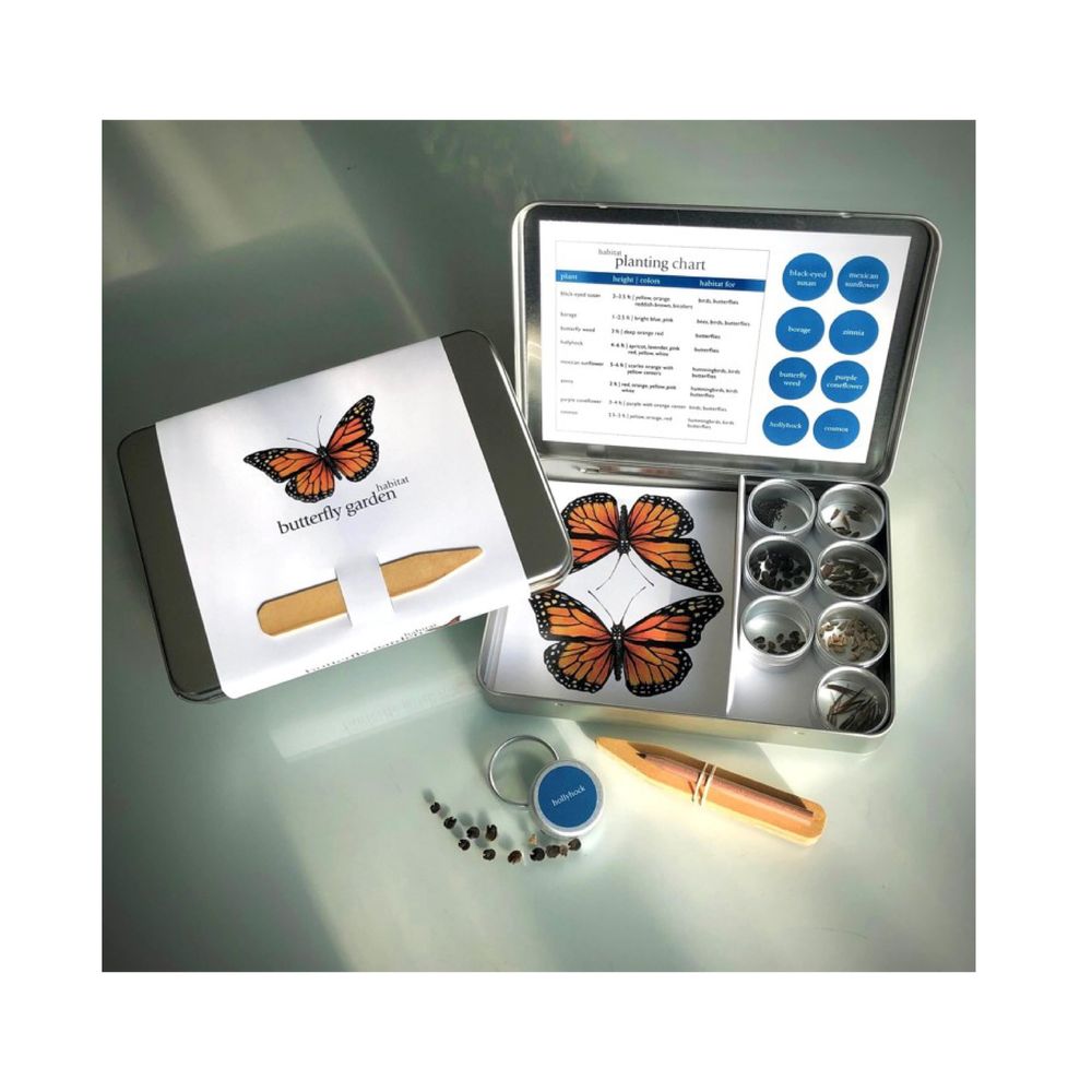 Butterfly Habitat (black-eyed susan, mexican sunflower, borage, zinnia, butterfly weed, purple coneflower, holly hock, and cosmos) A classic collection of flowers to grow in containers or garden space. Chosen for their beauty as well as their ability to attract beneficial wildlife such as butterflies, birds and bees. Includes: 8 varieties of seed, recycled US steel case, garden stakes, pencil, directions. Case 1" high x 7.25 long x 5.25" wide.
